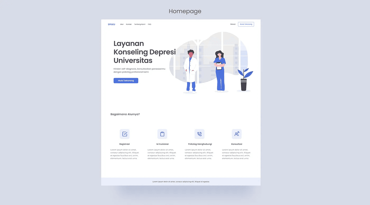 Homepage: Homepage berisi informasi alur penggunaan dan tombol Call to Action(CTA) untuk memulai registrasi. Selain itu, melalui navigation bar user dapat mengakses kontak, tentang kami, dan FAQ.