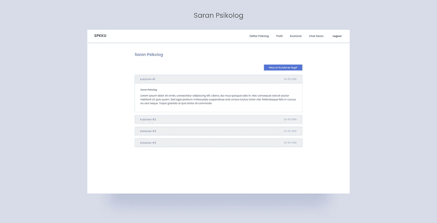 Saran Psikolog: Halaman lihat saran merupakan halaman dimana mahasiswa dapat melihat saran yang telah diberikan oleh psikolog. Saran akan muncul beberapa waktu setelah mahasiswa mengisi kuesioner.