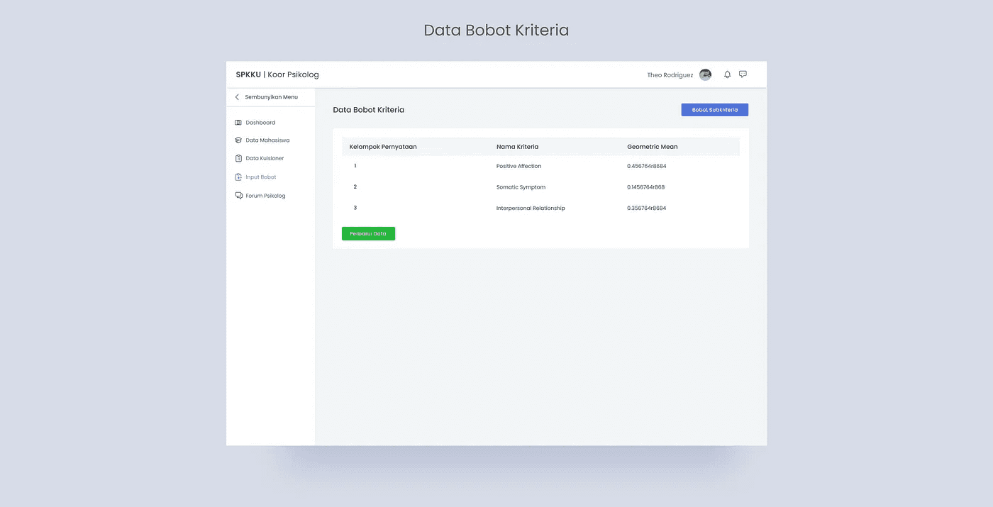 Data Bobot Kriteria: Setelah masing-masing psikolog mengisikan bobot preferensi kriteria dan subkriteria, koor psikolog dapat memulai proses komputasi dengan meng-klik tombol “perbarui data”.