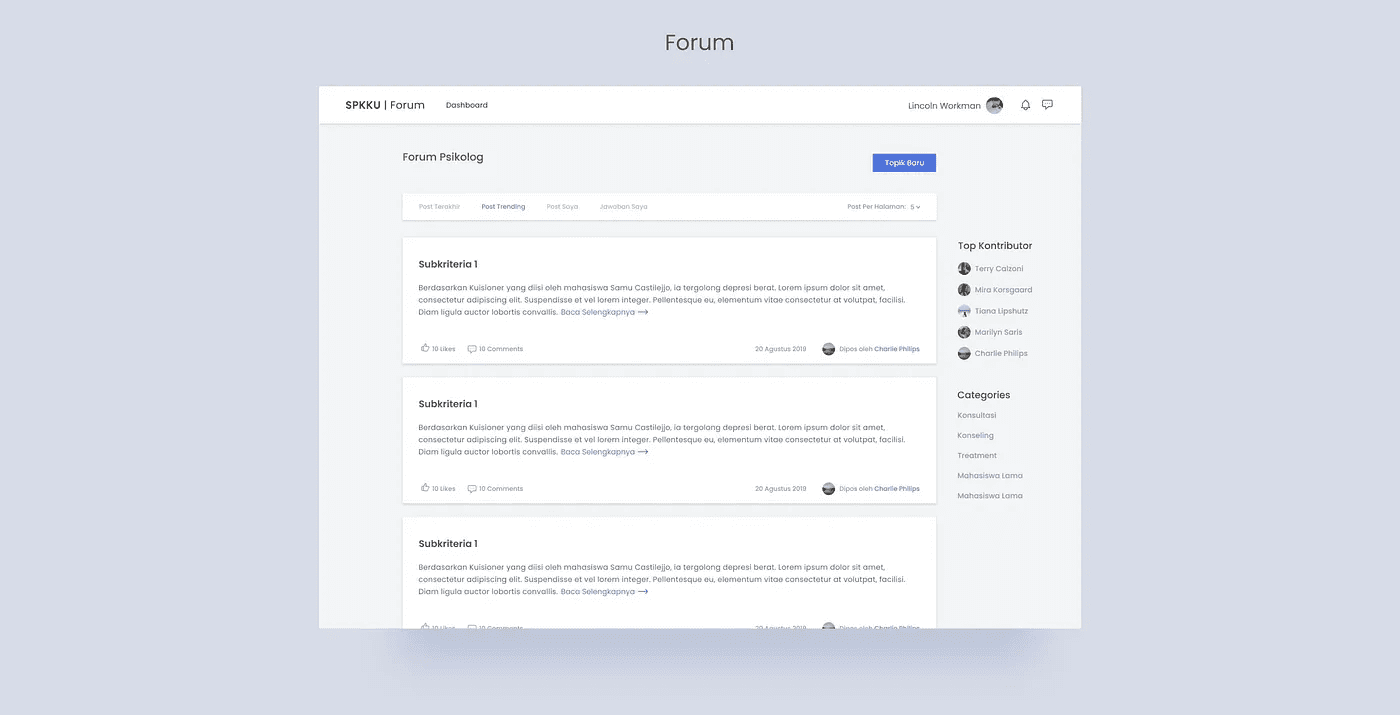 Forum: Halaman ini dapat digunakan oleh psikolog dan koordinator psikolog. Forum berfungsi sebagai wadah untuk psikolog dan koordinator psikolog saling berkomunikasi dan bertukar pikiran.