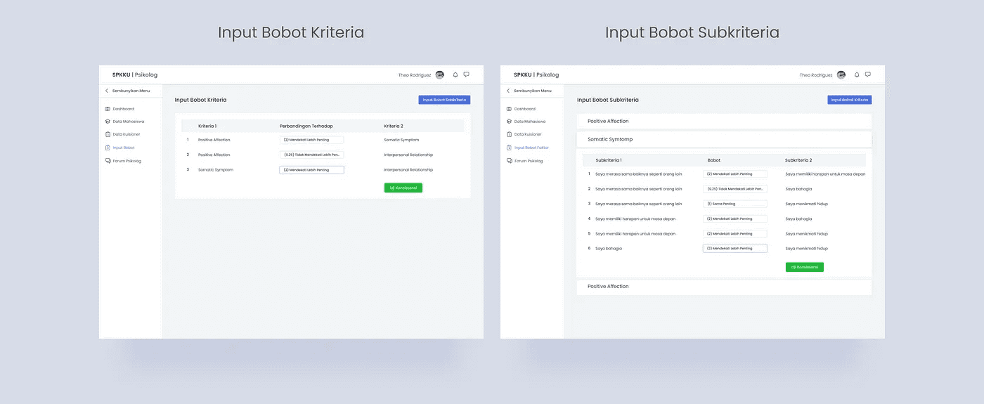 Bagian Koor Psikolog merupakan halaman yang hanya bisa diakses oleh user yang memiliki role koor psikolog. Koor psikolog memiliki semua fitur yang dimiliki oleh psikolog. Bedanya, koor psikolog dapat mengelola data psikolog dan dapat meng-update bobot kriteria.
