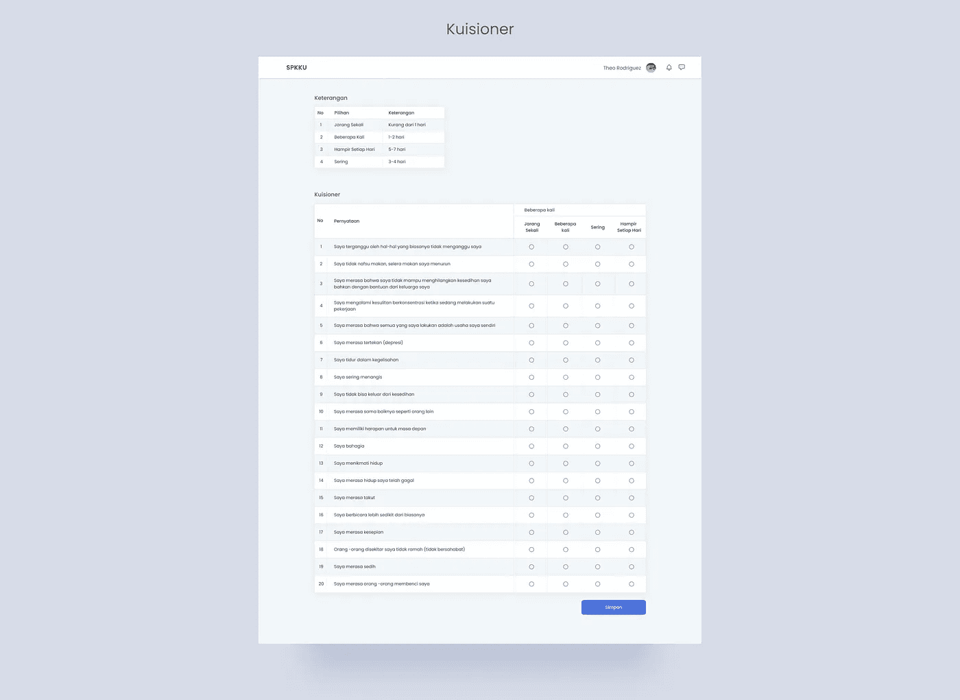 Isi Kuesioner: Pada bagian atas berisi keterangan dari masing-masing jawaban. Kemudian di bawahnya adalah kuesioner yang perlu diisi. Setelah kuesioner diisi, data akan disimpan dan hasilnya bisa dibaca oleh psikolog.