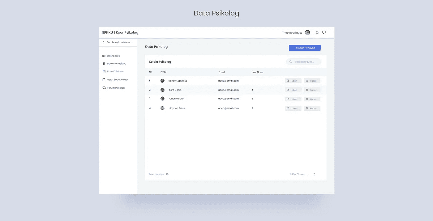 Data Psikolog: Koor psikolog dapat mengelola data psikolog seperti menambahkan hingga merubah hak akses psikolog.