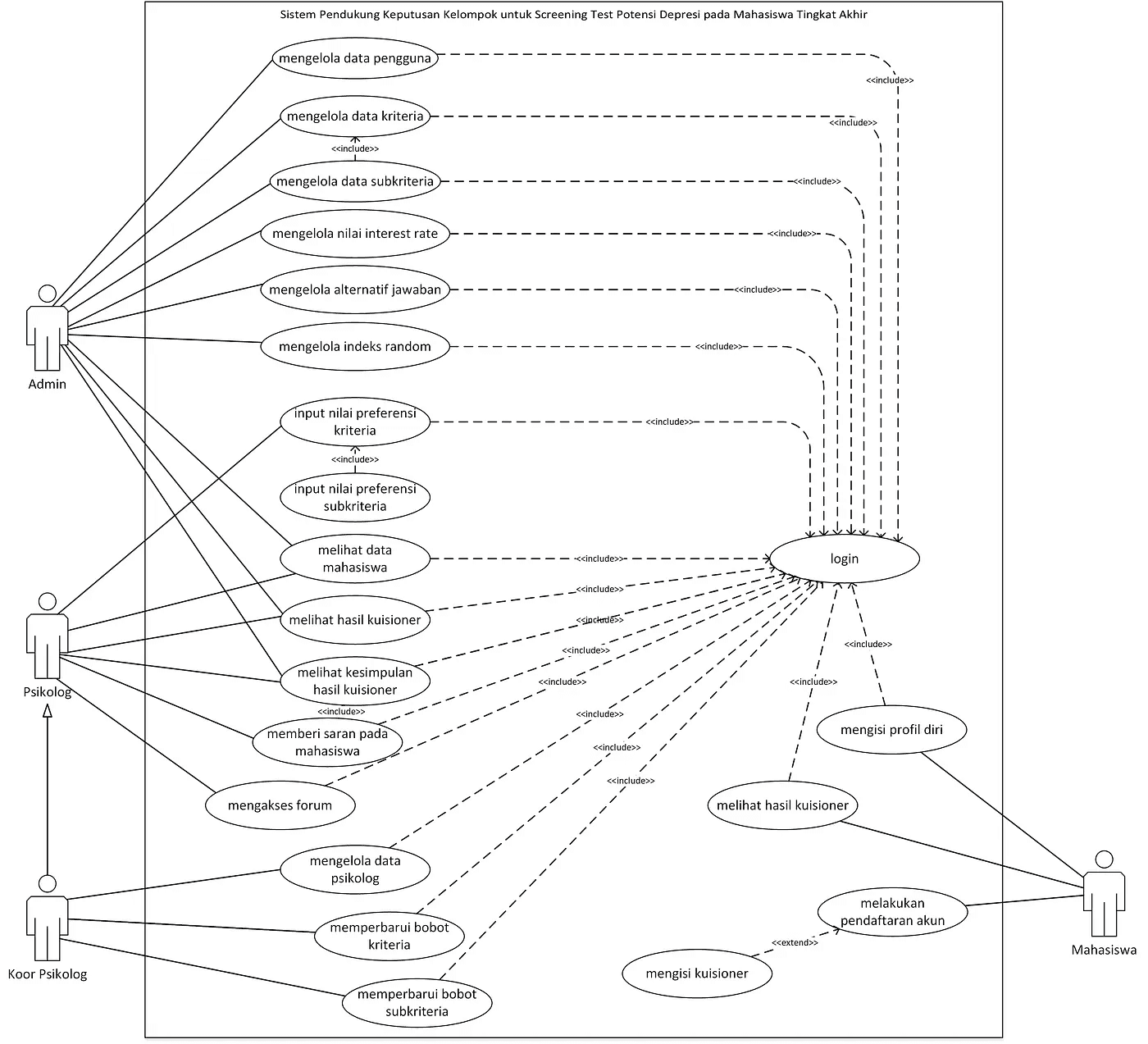 Pada use case diagram diatas, sistem memiliki empat aktor. Aktor tersebut yaitu admin, mahasiswa, psikolog, dan koordinator psikolog. Setiap aktor dapat melakukan fungsi yang sama di dalam sistem.